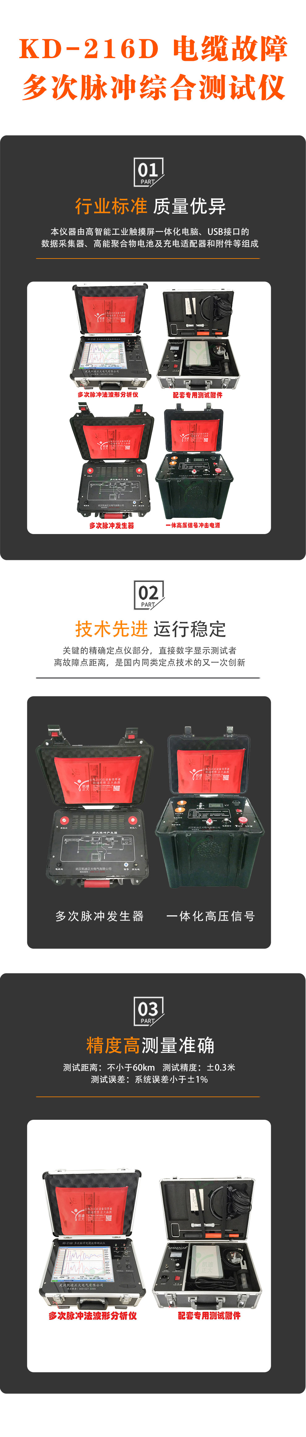 3.   KD-216D電纜故障多次脈沖綜合測試儀是迎合工業級電力行業方案和IT時代的快速發展,將原來電纜故障測試儀的局限性,用工控嵌入式計算機平臺系統、網絡服務業務、USB通信技術系統化,提高了儀器的使用功能和利用價值以及便捷的現場環境操作。特別對于日益增多的地埋電纜資料提供了一套管理軟件。整套系統滿足中華人民共和國電力行業標準《DL/T849.1~DL/T849.3-2004》電力設備測試儀器通用技術條件,該系統測試由系統主機和故障定位儀以及電纜路徑儀三部分組成,用于電力電纜各類故障的測試,電纜路徑、電纜埋設深度的尋測和電纜檔案資料的日常維護管理,以及鐵路、機場信號控制電纜、和路燈電纜故障的測試。