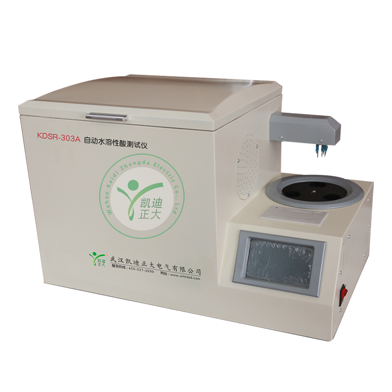 我公司生產的KDSR-303A型自動水溶性酸測試儀(比色法)是根據《GB/T7598-2008運行中變壓器油水溶性酸測定法》及相關標準設計制造。采用大屏幕彩色液晶顯示器,利用微處理器控制,可以根據用戶的設定條件自動完成加熱、恒溫、振蕩、取樣、測試、清洗、打印等功能,可以一次性測量1-3個樣品,縮短了用戶的測試時間,提高了工作效率,減輕了工作人員的勞動強度;并支持無線傳輸功能。