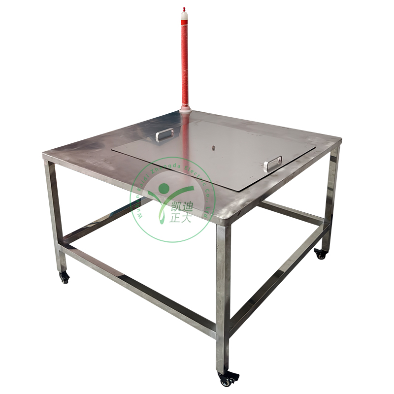 本裝置依據 DL/T976-2017 電力行業標準研發,適用于絕緣衣、絕緣褲、絕緣披肩、絕緣套袖、絕緣毯等防護用品的工頻耐壓測試,支持 0 至 50kV 多電壓等級檢測 。采用不銹鋼框架, 電極由不銹鋼材質制成。