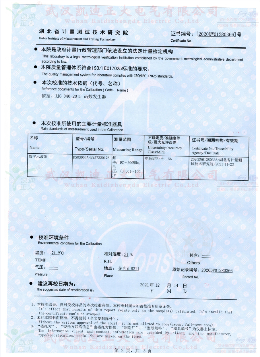 繼我司抽檢10套KDJK-10A配網(wǎng)單相接地故障定位儀送往湖北省計量測試技術(shù)研究院校準(zhǔn),此次獲得電學(xué)所檢測設(shè)備DS0S054A數(shù)字示波器標(biāo)準(zhǔn)設(shè)備的數(shù)據(jù):輸出波形正玄波、異頻信號21.627Hz、輸出電壓8.677kV、頻率測量的不確定度0.006%。符合武漢凱迪正大公司和國家電力規(guī)程標(biāo)準(zhǔn)。同時獲得科學(xué)技術(shù)部火炬高技術(shù)產(chǎn)業(yè)開發(fā)中心、武漢市科技局認(rèn)定武漢市創(chuàng)新產(chǎn)品證書。