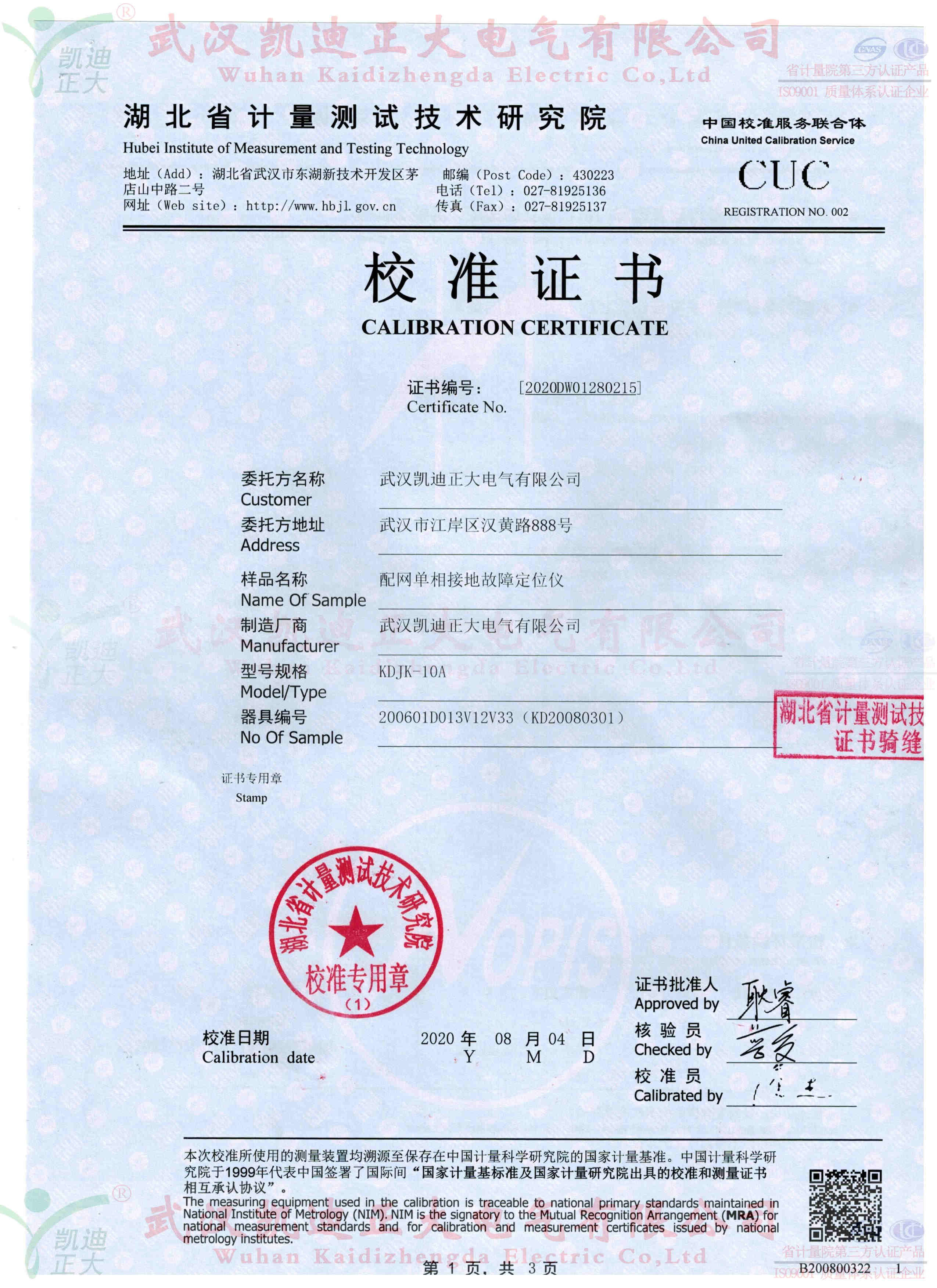 配網單相接地故障定位儀獲得省計量電學所校準合格證書