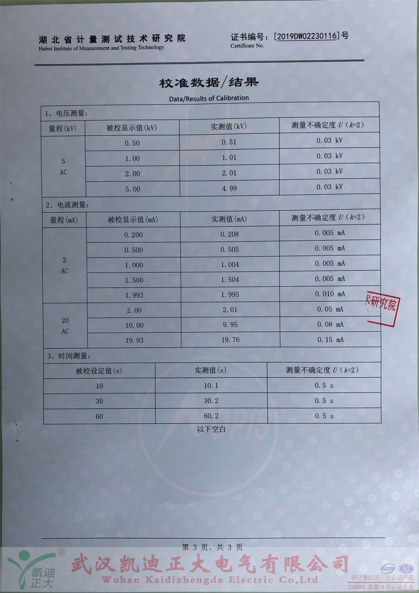 本次校準所使用的主要計量標準器具:耐電壓測試儀校驗儀