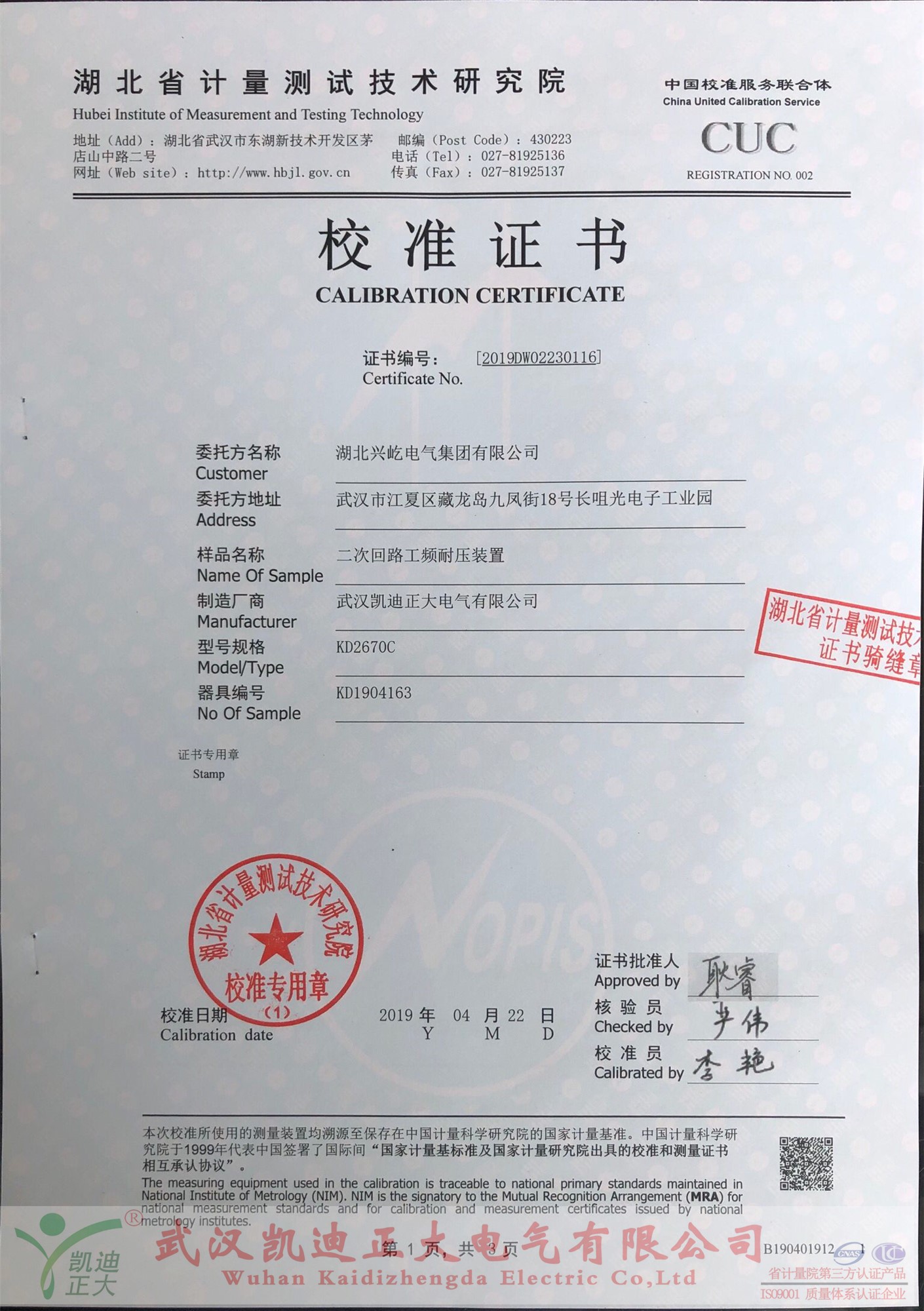 購買后便送往中國校準服務聯(lián)合體-湖北省計量測試技術研究院檢定,由省計量院出具的《校準證書》,證書編號:2019DW02230116,校準員:李艷,檢驗員:嚴偉,證書批準人:耿睿。