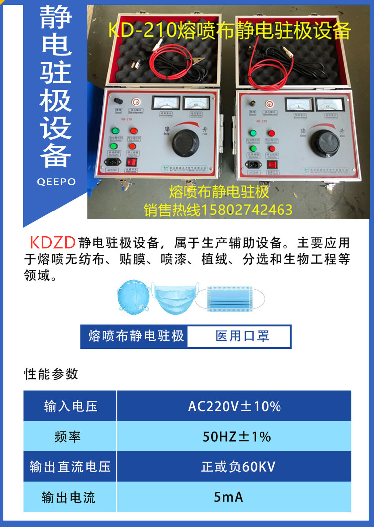 生產(chǎn)的熔噴布靜電駐極設(shè)備,是由高壓發(fā)生器和靜電放電極(棒)組成。高壓發(fā)生器給放電極(棒)提供負(fù)(或正)高壓。使放電極(棒)發(fā)射負(fù)離子(或正離子)然后使物體(工件)帶上電荷(人工電荷)。電壓越高,有效范圍越大。
