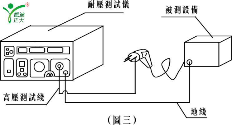 按圖三將耐壓儀與被測(cè)整機(jī)連接,接通被測(cè)整機(jī)電源開(kāi)關(guān),根據(jù)被測(cè)整機(jī)產(chǎn)品標(biāo)準(zhǔn)設(shè)置漏電流報(bào)警值,然后再按4條或5條所進(jìn)行測(cè)試。如若被測(cè)整機(jī)產(chǎn)品標(biāo)準(zhǔn)沒(méi)有規(guī)定具體漏電流報(bào)警值,則推薦按下式計(jì)算:Iz=Kp(U/R)...............(1)