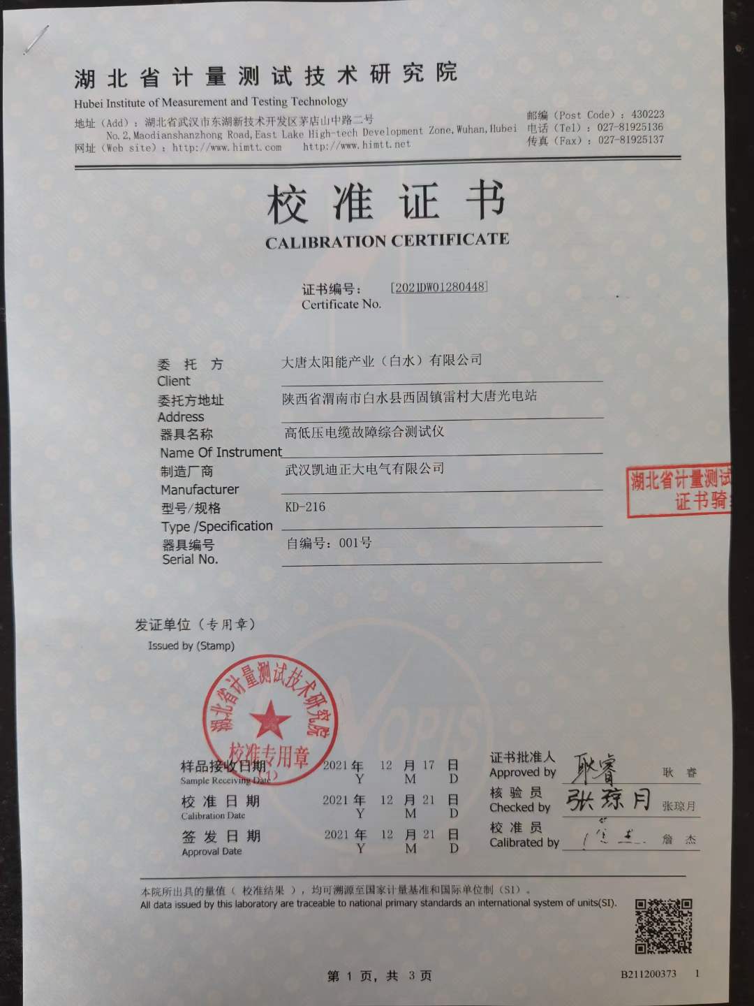 2021年12月22日,大唐太陽能產業(白水)有限公司采購我公司一批高低壓電纜故障綜合測試儀。為彰顯本公司產品的實力與質量,凱迪正大雷總攜帶本公司生產的KD-216高低壓電纜故障綜合測試儀前往湖北省計量測試技術研究院中南國家計量測試中心對產品進行檢測,經過多次測量與檢測后,產品完整通過每一條檢測并獲得了校準證書。
