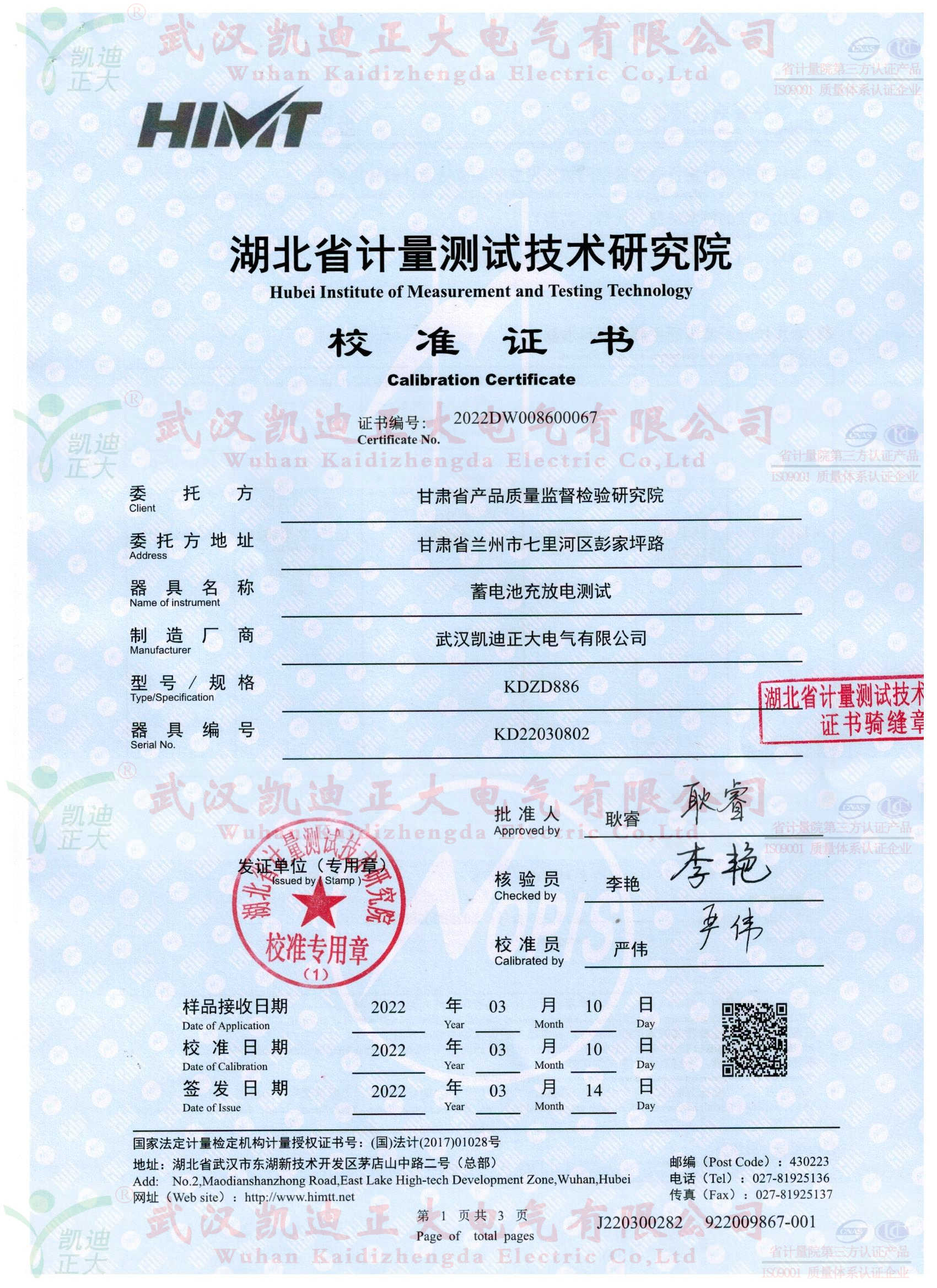 甘肅省產品質量監督檢驗研究院在了解我司KDZD886蓄電池充放電測試儀集蓄電池恒流放電,智能充電,活化于一體等功能。隨即采購KDZD886蓄電池充放電測試儀,要求獲得湖北省計量測試技術研究院的檢定合格報告。
