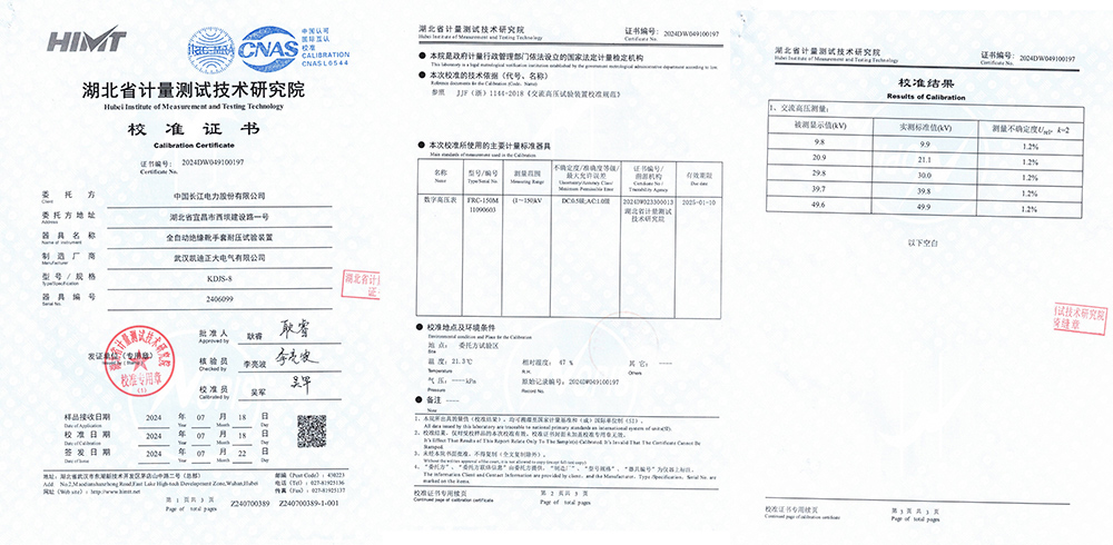 中國長江電力股份有限公司采購的我司KDJS-8全自動絕緣靴手套耐壓試驗裝置,在經過湖北省計量測試技術研究院的嚴格檢測后,成功通過了參照JJF(浙)1144-2018《交流高壓試驗裝置校準規范》的校準測試,標志著該設備在性能指標、安全標準及技術各方面均符合要求。這一校準不僅展示了凱迪正大電氣產品的品質,也突顯了凱迪正大電氣在設備研發生產方面的實力。