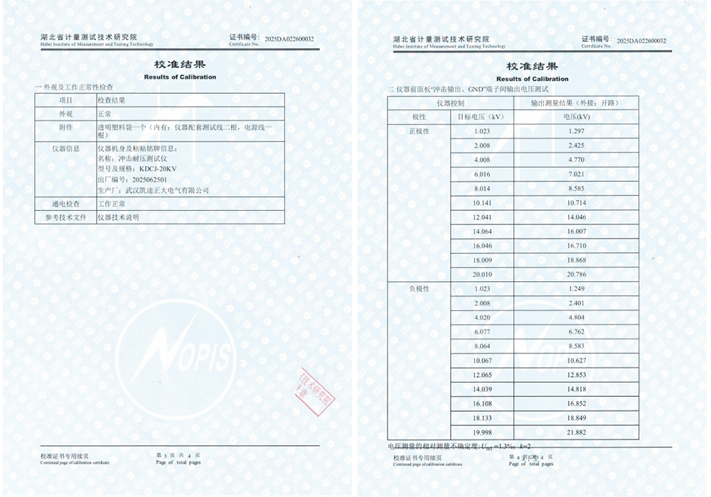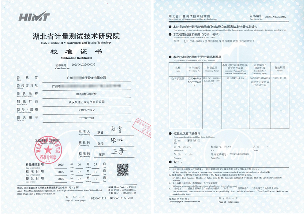 2025年7月11日,廣州某電子設備有限公司向武漢凱迪正大電氣采購的KDCJ-20kV沖擊耐壓測試儀,通過湖北省計量測試技術研究院的專業校準,驗證了測試儀的準確性和可靠性。