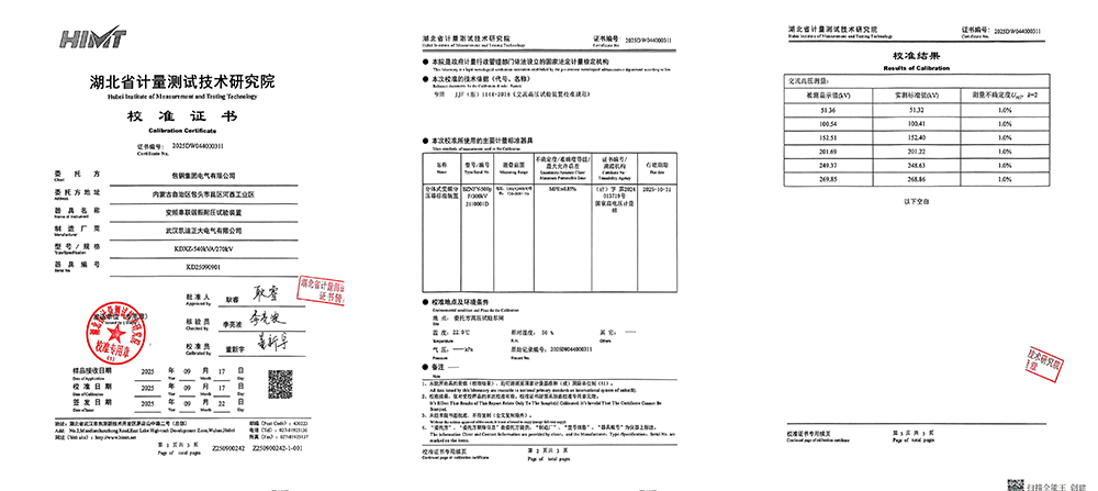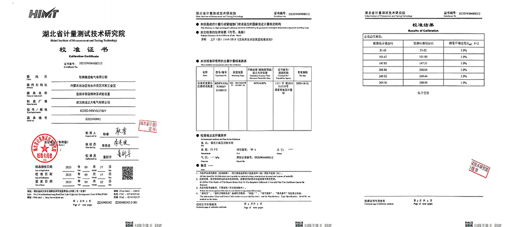 在電力設(shè)備制造與運(yùn)維領(lǐng)域,高壓耐壓試驗(yàn)是確保輸變電設(shè)備安全可靠運(yùn)行的關(guān)鍵環(huán)節(jié)。變頻串聯(lián)諧振耐壓試驗(yàn)裝置因其輸出波形純凈、效率高、對(duì)試品損傷小等優(yōu)勢(shì),已成為高壓試驗(yàn)的常用設(shè)備。近期,包鋼集團(tuán)電氣有限公司從武漢凱迪正大電氣有限公司采購(gòu)了兩套型號(hào)為KDXZ-540kVA/270kV的變頻串聯(lián)諧振耐壓試驗(yàn)裝置,湖北省計(jì)量測(cè)試技術(shù)研究院對(duì)其進(jìn)行校準(zhǔn)。2025年9月,兩套裝置均順利通過校準(zhǔn),獲得證書編號(hào)分別為2025DW044000312和2025DW044000311的校準(zhǔn)證書。