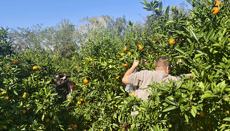 午餐的歡愉余韻未消,大家便迫不及待地提上果籃,奔向那片金色的海洋,真正的“探險”就此開始!步入橘林,漫山遍野的橘樹碩果累累,金黃的果子掛滿枝頭,清新的果香沁人心脾。同事們瞬間化身“探險家”,三五成群,穿梭于果樹之間。