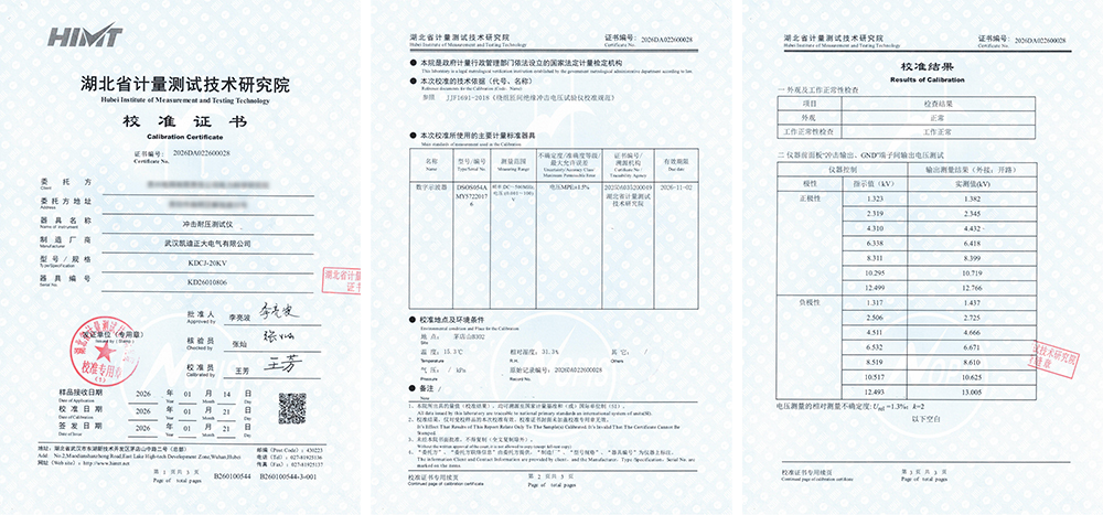 在電力系統(tǒng)的運行維護與設備檢測中,各類專用測試儀器的準確性與可靠性直接影響著電網安全、設備評估的科學性以及故障診斷的有效性。近期,武漢凱迪正大電氣有限公司生產的三款測試設備——KDCJ-20kV沖擊耐壓測試儀、KDYDJ交直流耐壓測試儀以及KD700X溫度巡檢儀,均通過了湖北省計量測試技術研究院的權威校準,并取得了相應的校準證書。這三份文件不僅僅是合規(guī)性的證明,更是設備技術性能的體檢報告,其校準數(shù)據(jù)為我們解讀設備精度和可靠性。